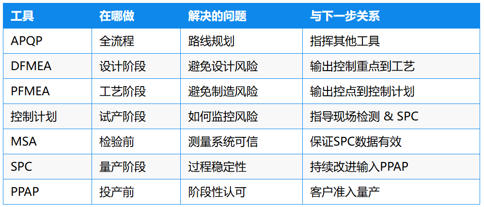 你可以把APQP看成六大工具的领头羊,没有它,其他工具全乱套。