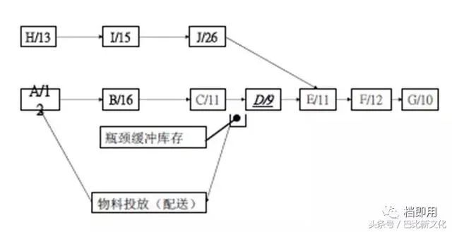 ● 瓶颈驱动法的原理:如下图,D工序产能为9个/H,为产能最低的工序,在制定生产计划和物料计划时,就要根据D工序的需求生产,D工序需要多少,上工序就生产多少,以保证D工序的缓冲库存量为最佳。避免在制品堆积。