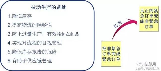 拉动式生产,是根据瓶颈工序发出的需求信号,来决定上工序何时生产、生产什么、生产的数量以及何时停产、何时进行生产切换。是瓶颈工序拉动非瓶颈工序,而不是单指后工序拉动前工序。瓶颈工序需要时安排瓶颈上工序生产,不需要时不安排生产。同理,客户需要时根据订单生产周期安排生产,客户不需要时不安排生产。