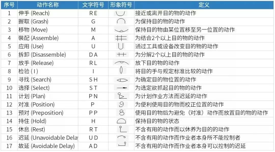 动作分析法:对操作者细微身体动作进行分析,删除其无效动作,提高生产效率